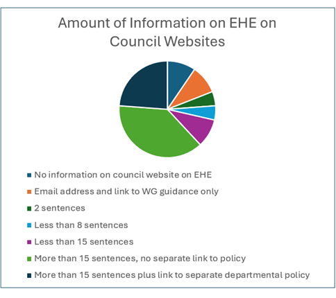 No information page on EHE could be found on the websites of two LAs, two had simply an email address and links to WG guidance, another had two sentences and address/phone number, another had seven sentences. None of the LAs with minimal information gave links to local policy as a separate document. Thus, it is extremely difficult to gain any impression of the understanding of these councils from the information in the public domain on their websites.