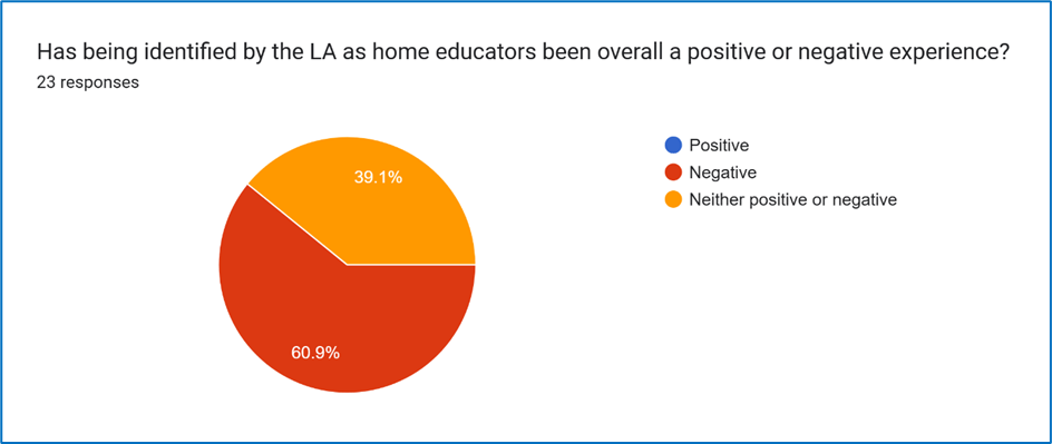 Where two thirds of respondents indicated being identified by the LA as home educators had been a negative experience, and no respondents found this to have been or become a positive experience.
