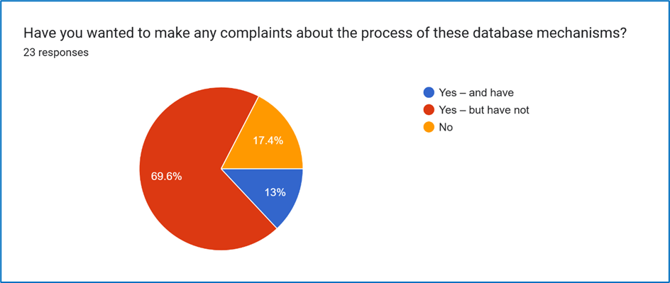 Only 17.5% of respondents had not considered making a complaint about the process of database mechanisms.