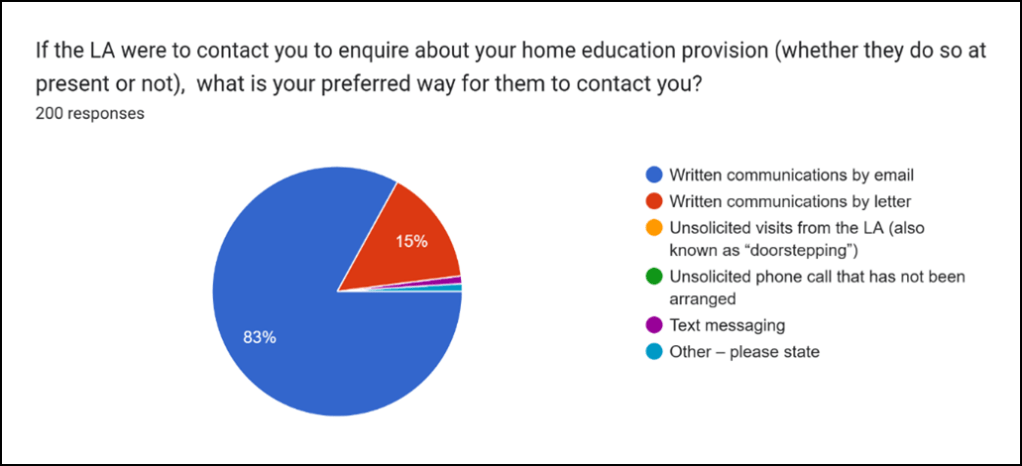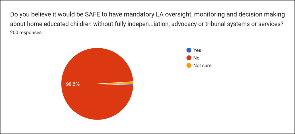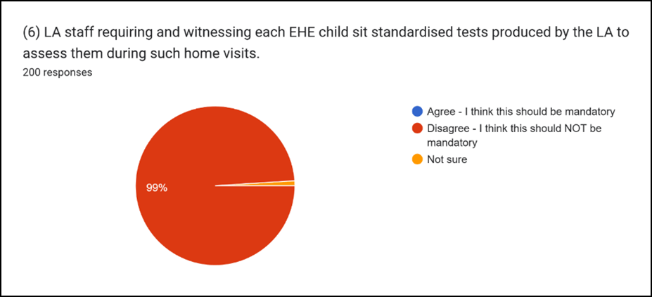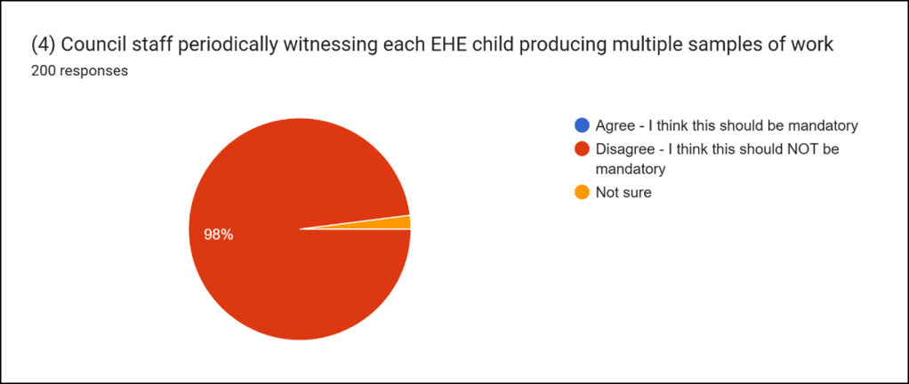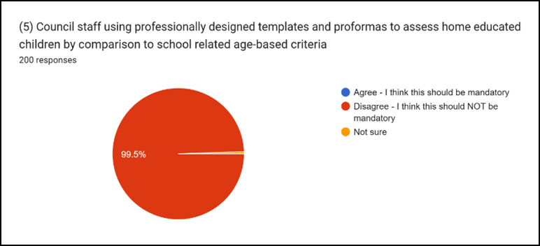 - The overriding message of the responses from 110 respondents into this point considered the concept would demonstrate a lack of understanding of pedagogy and educational philosophies and approaches often utilised by home educators.