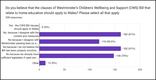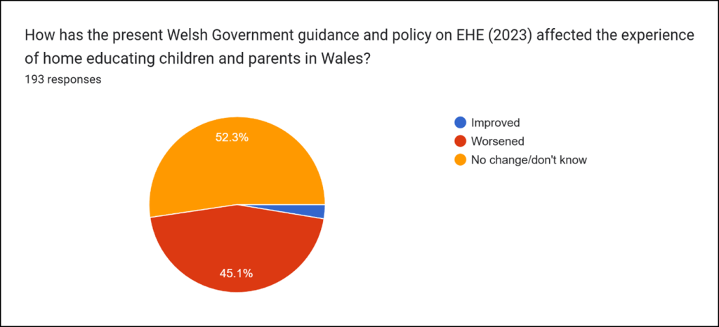 As there has been no engagement with or involvement of those in Wales with lived experience in the above processes or policy developments, this survey was conducted by volunteer Welsh home educators, in the hope of facilitating engagement by Senedd Members and Members of Parliament, to allow a fuller evaluation both of the impact of the CWS Bill and of various claims within the commissioned report on EHE guidance.